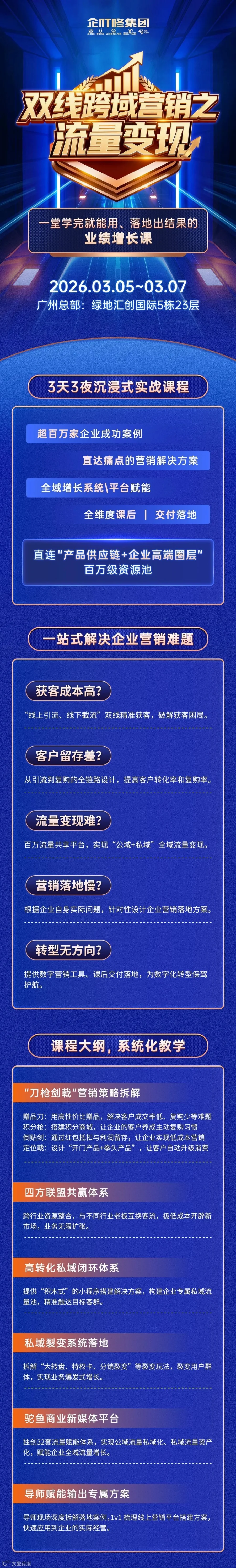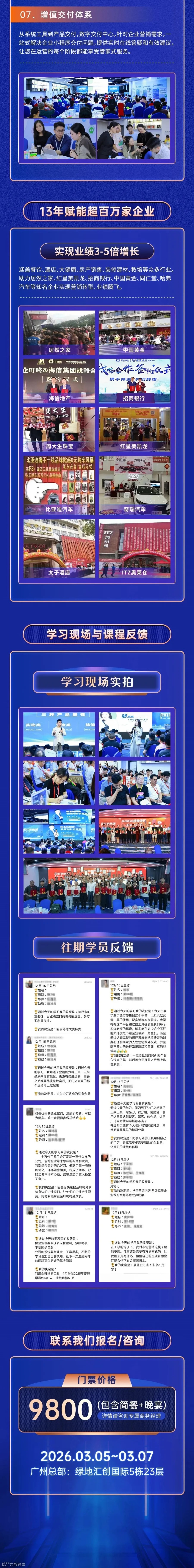 结果:企业家学完可掌握全场景招商成交技巧,轻松组织高转化招商会,搭建可持续的招商成交系统,实现业绩稳步增长。