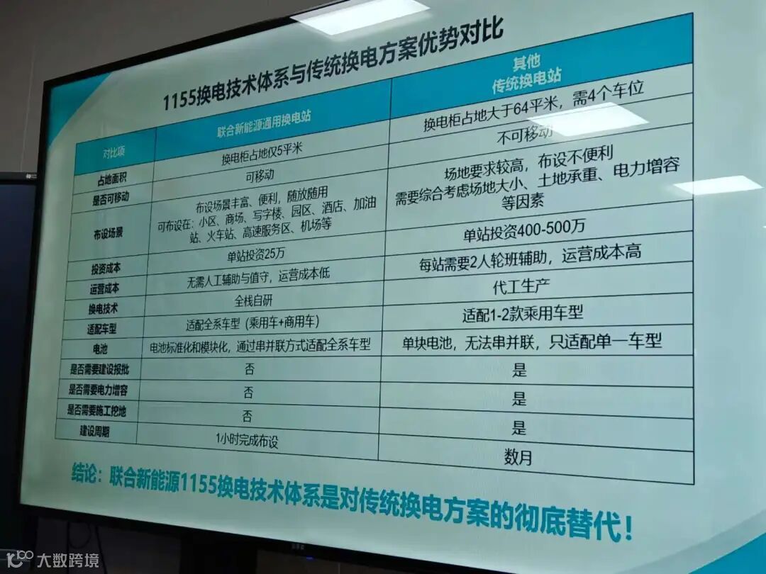 联合新能源(以下简称“联合”)拥有独创的前端换电技术,其核心为“车电分离+电池标准化并共享”,通过“1155 技术体系”(即 1 块标准电池不同数量串并联组合、一个通用换电柜、适配 5 类商用车和 5 类乘用车换电)实现高效补能,单次换电仅需 3一5 分钟。其换电站具备三大优势:一是建设成本低:单站成本仅为传统底盘换电站的 1/20,占地仅 3 个停车位;二是布局灵活:1 小时即可部署,支持高密度布点(目标 3 公里服务半径);三是通用性强:1 个站可为 5类商用车和 5 类乘用车的全系车型换电。