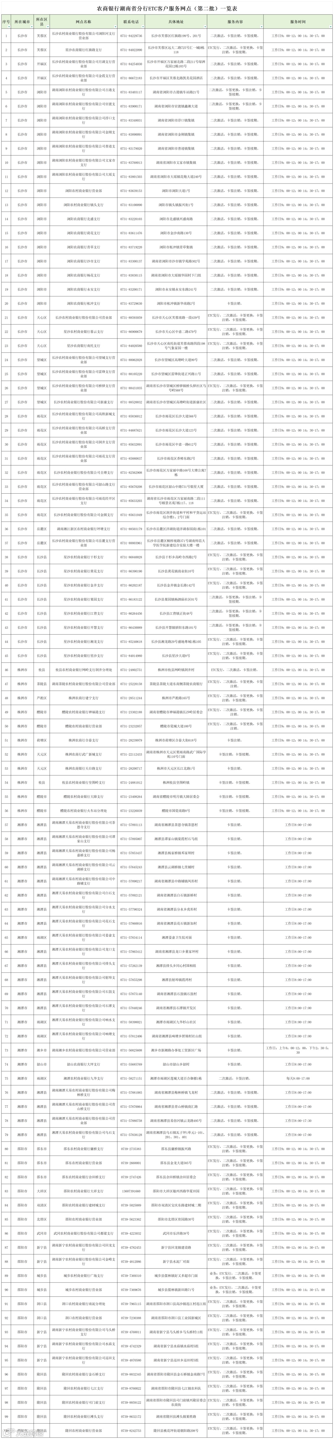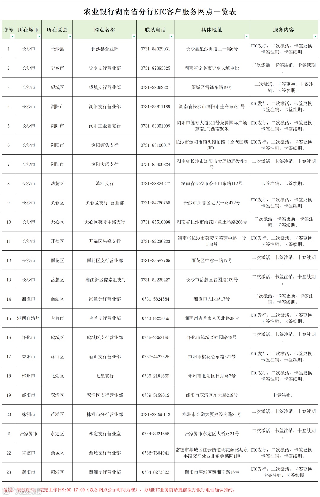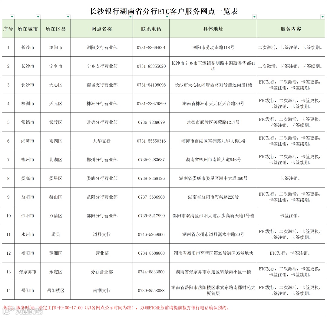 农商银行湖南省分行ETC客服网点一览表(第二批)