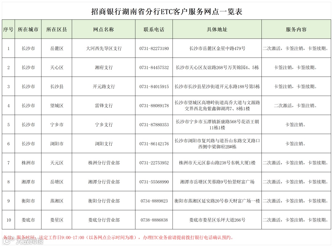 建设银行湖南省分行ETC客服网点一览表(第二批)