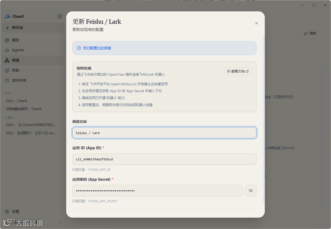 飞书、telegram等通讯工具的连接,我们讲过好多次了,我们就不着重讲了。ClawX 的优点在于,它把连接的方法,很详细的写在了连接配置的位置。