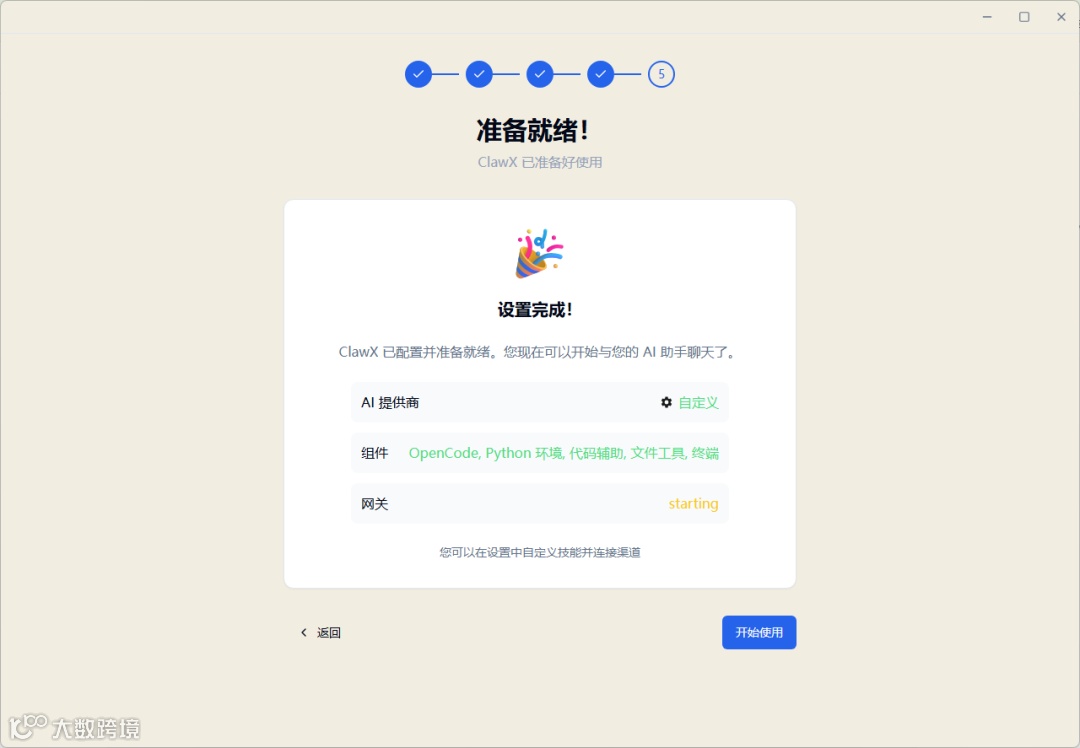 完成上述配置,安装阶段就正式结束了!此时,你可以点击开始使用按钮,进入对话框了。