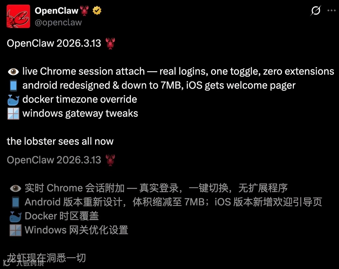 OpenClaw发布2026.3.13更新,引入了实时Chrome浏览器session链接(live Chrome session attach)功能,实现了无需任何浏览器插件即可直接关联用户实时会话的技术突破。