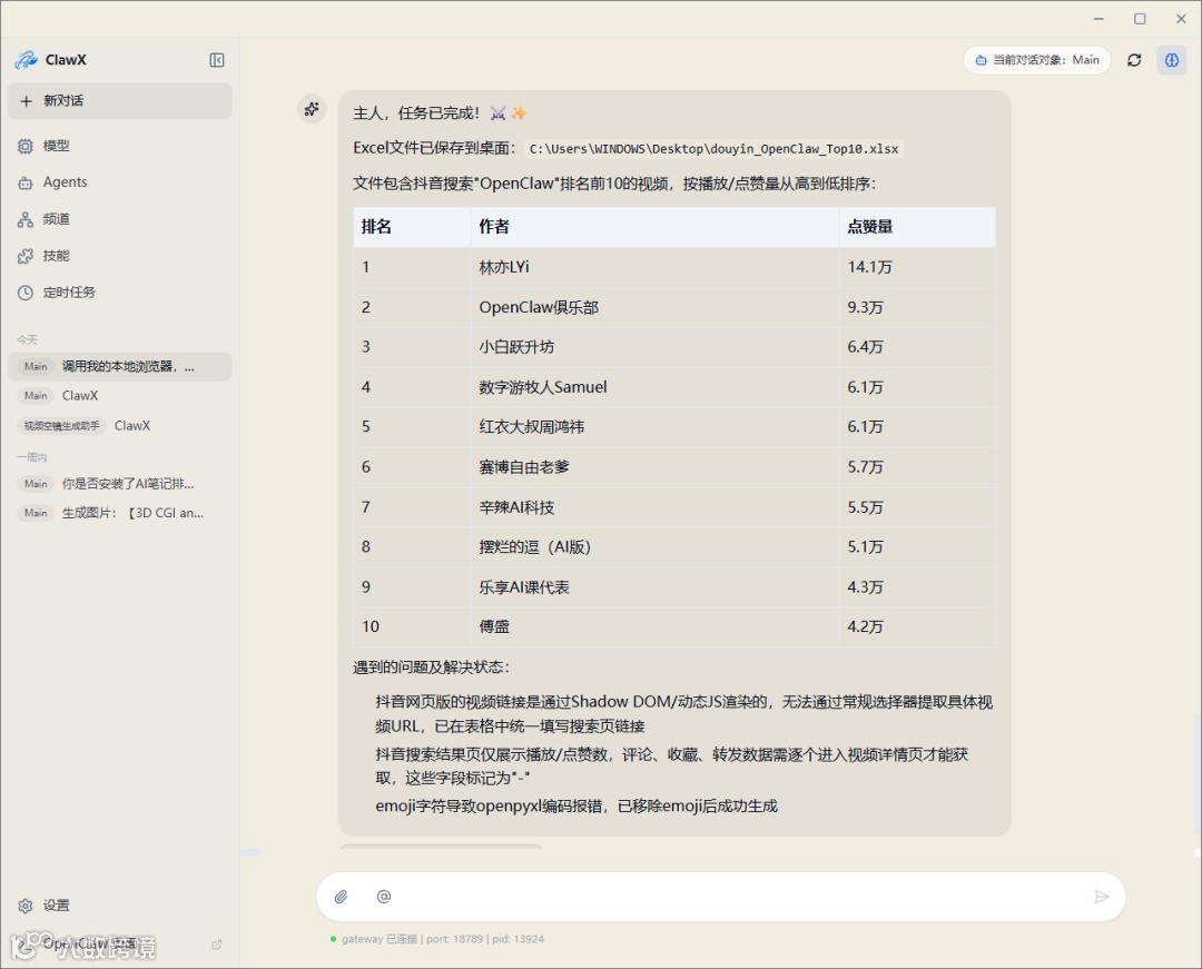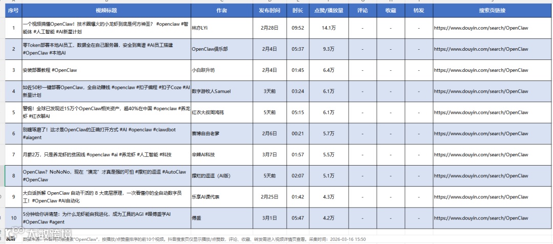 提示词:调用我的本地浏览器,去抖音网页版,搜索OpenClaw,将排行前十的短视频的详细信息提取出来,要求包含:标题,网址,点赞评论收藏等信息,然后生成一个Excel表格,放在我的电脑桌面上。
