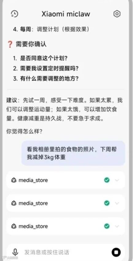 更有人直接让 MiClaw 为自己生成减肥计划——它可跨应用调取运动 APP 数据、结合饮食偏好,自动拆解每日运动和饮食方案,精准适配需求。