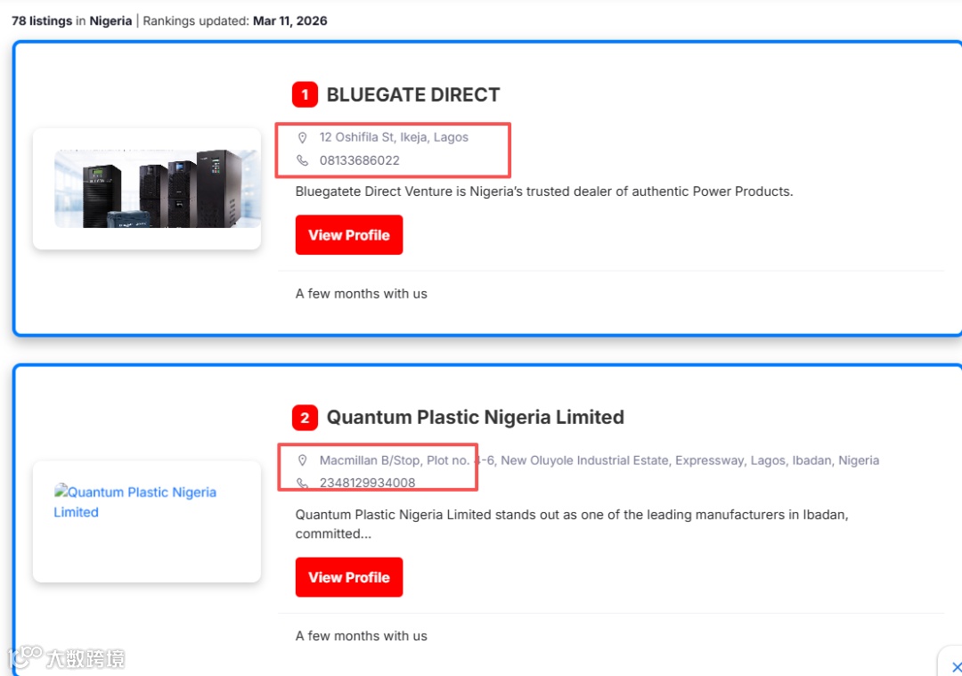 尼日利亚用的最多的地图还是谷歌地图,收录了大量的尼日利亚本土的企业信息,还可以看到客户的实景以及电话等等联系方式,非常推荐的客户开发方式之一。