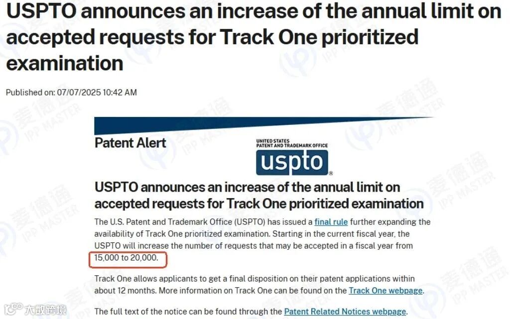 2025年7月8日,美国专利商标局(USPTO)发布重磅公告,将专利优先审查通道Track One的年度可接受请求量从15000件大幅提升至20000件。这是继2019年、2021年两次扩容后,USPTO再次提高该通道申请限额,为布局美国市场的跨境卖家送上关键政策红利,也让美国发明专利快速获权、高效维权成为更易实现的目标。