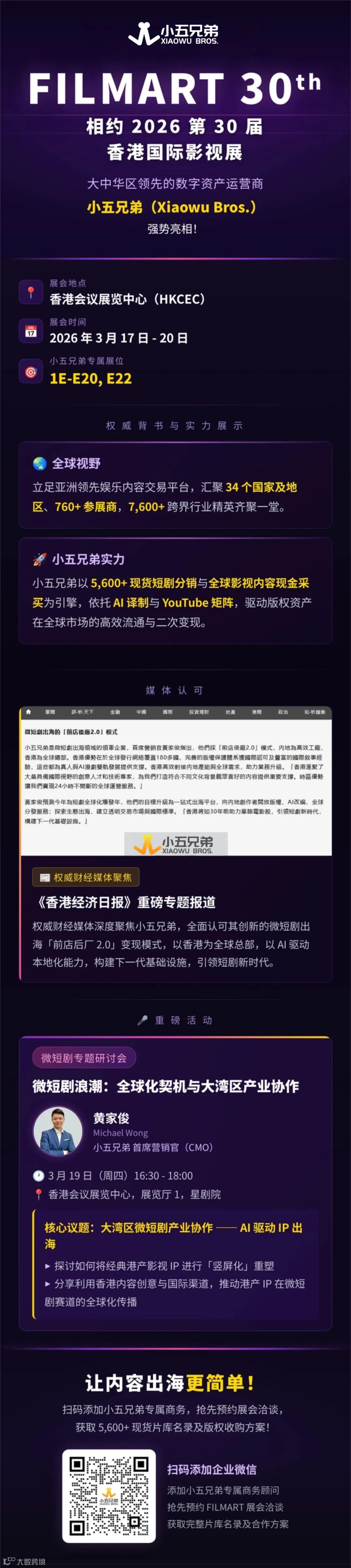 3月17日至20日,第30届香港国际影视展(FILMART)将在香港会议展览中心(HKCEC)举行。小五兄弟将携5,600+授权现货短剧片库及全球影视版权变现方案参展,展位号为1E-E20、1E-E22,与全球影视机构、平台买家及内容伙伴共同探讨短剧内容的全球发行与商业变现路径。