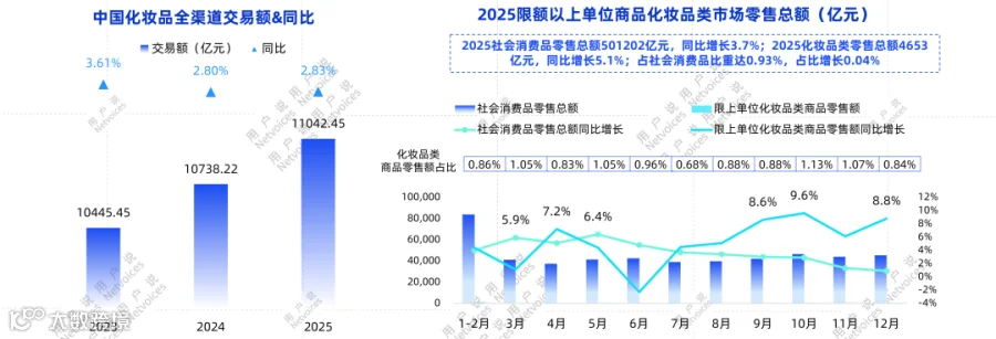2025化妆品类商品零售总额达1.1万亿元,同增2.83%