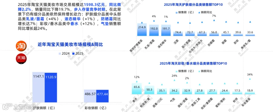 2025年淘宝天猫美妆交易额1598.3亿元,同比下降2.2%,销量下降19.7%,进入存量竞争阶段。