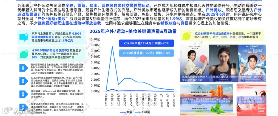 2025年户外运动彩妆声量同比增长75%,全年互动量达1.99亿,关注度达历史高点;健身人群亦同步追求运动中兼具功能与美感的精致妆容体验。