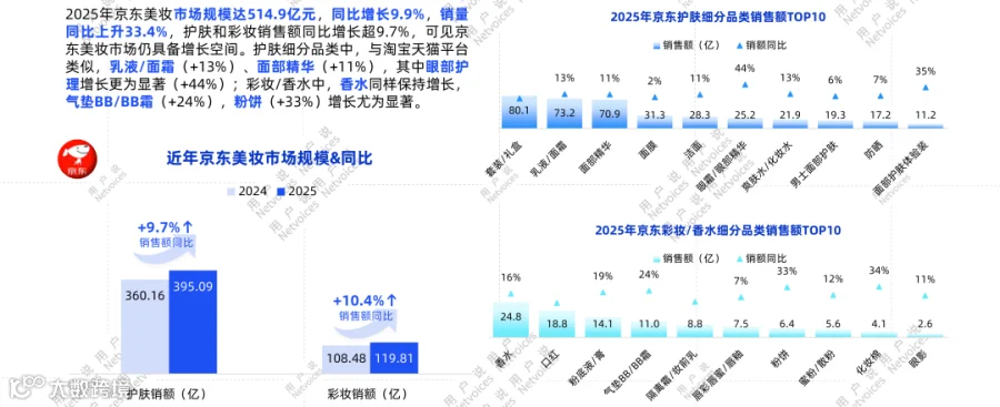 2025年京东美妆市场达514.9亿元,同比增长9.9%,销量增长33.4%,护肤与彩妆销售额均同比增长超9.7%,显示持续增长潜力。