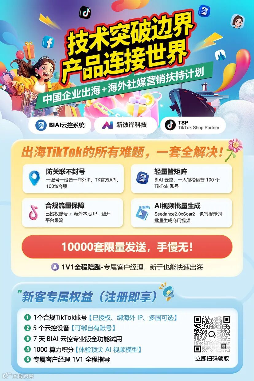 新彼岸科技 × BIAI 云控联合推出“中国企业出海 + 海外社媒营销扶持计划”,一站式解决 TikTok 出海全链路痛点,助力企业高效开拓海外市场。