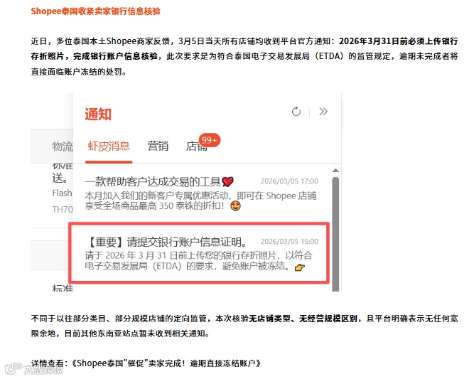 Shopee泰国站要求卖家于3月31日前上传银行存折照片完成账户核验,逾期未完成者账户将被冻结,系配合泰国电子交易发展局监管要求。