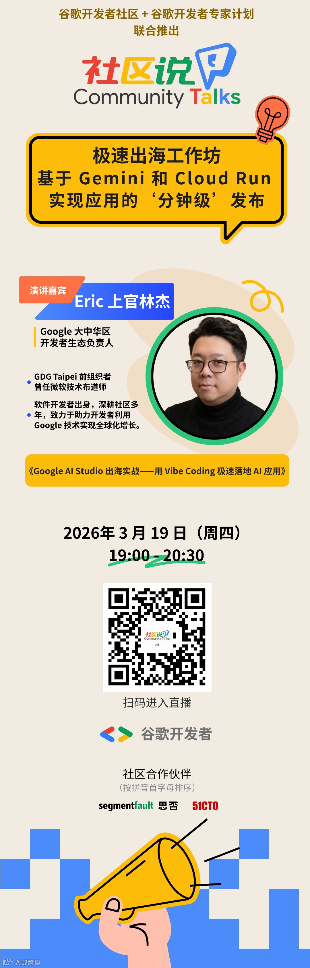 在出海开发竞争加剧的当下,将创意快速转化为全球可访问的生产级AI应用,仍面临模型调优、成本控制、容器化部署等多重工程挑战。本期“社区说”聚焦实战,现场拆解 Gemini 与 Google Cloud Run 的高效组合,实现从 Prompt 到全球部署的“分钟级”交付。