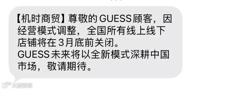 2 月 27 日,多位消费者收到 GUESS 发来的官方短信通知。公告内容显示,因品牌经营模式调整,GUESS 将于3 月底前正式关闭国内所有线上、线下门店,未来将以全新模式继续布局中国市场。