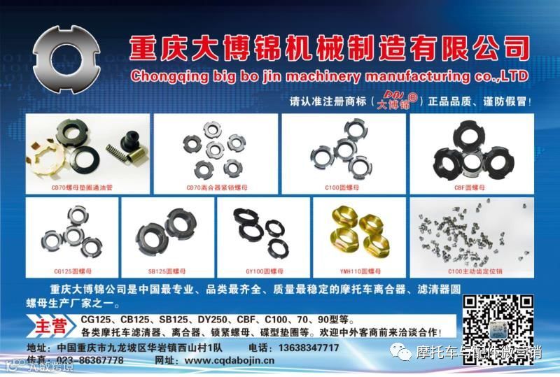 重庆大博锦公司专业生产摩托车离合器、滤清器圆螺母,品类齐全、质量稳定,通过ISO9001认证。主营型号:CG125、CB125、SB125、DY250、CBF、C100、CD70、ZY150、YMH110、YB110、YX100等。产品包括滤清器、离合器、锁紧螺母、碟型垫圈等。请认准DBJ注册商标,谨防假冒。联系人:王先生,电话:13638347717,传真:023-86367778,官网:http://www.cqdabojin.cn/。