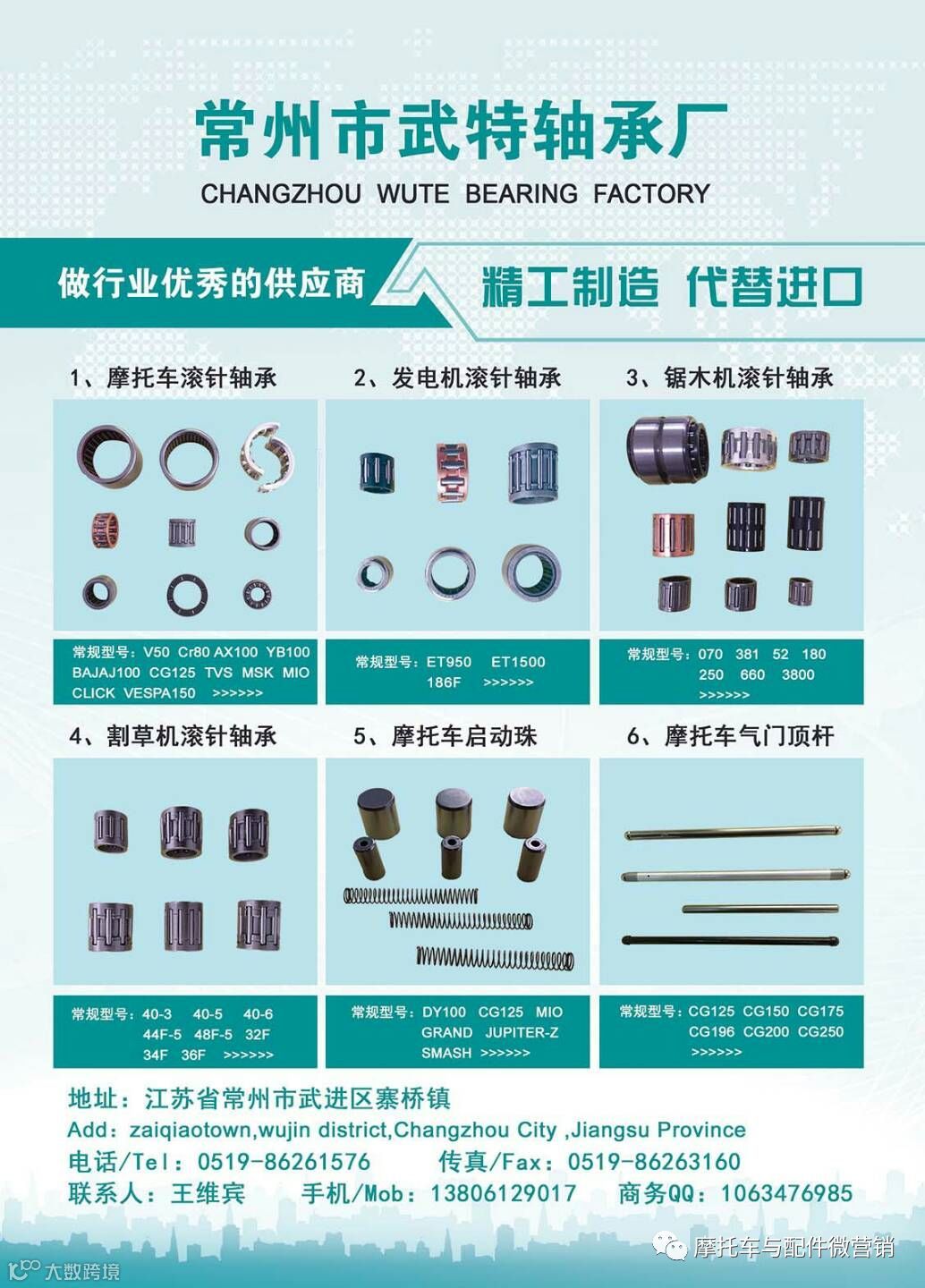 常州市武特轴承厂专业生产滚针轴承,适用于摩托车、发电机、锯木机、割草机,同时生产摩托车启动珠、气门顶杆等。电话:0519-86261576,联系人:王维宾,手机:13806129017。