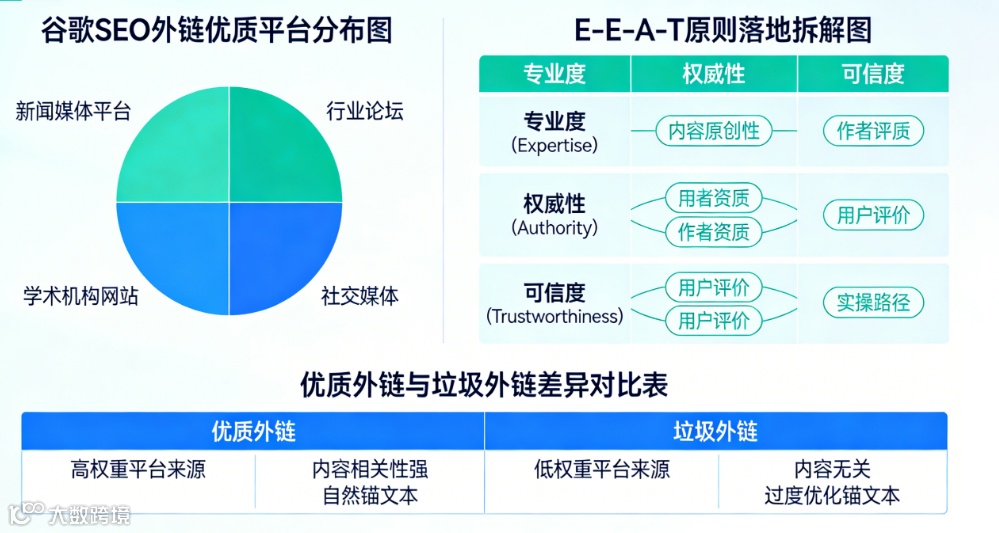 站外优化是提升网站权重的核心,高阶策略需围绕E-E-A-T原则(经验、专业、权威、可信),构建高质量外链与品牌影响力。