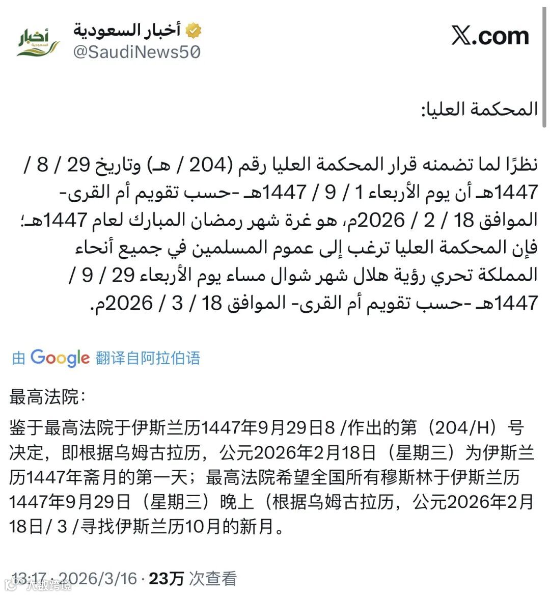 据沙特本地媒体SaudiNews50报道,沙特阿拉伯最高法院呼吁全国穆斯林于2026年3月18日(星期三)傍晚观测伊斯兰历十月——舍瓦尔月(Shawwal)新月,以确认斋月结束及开斋节起始日期。