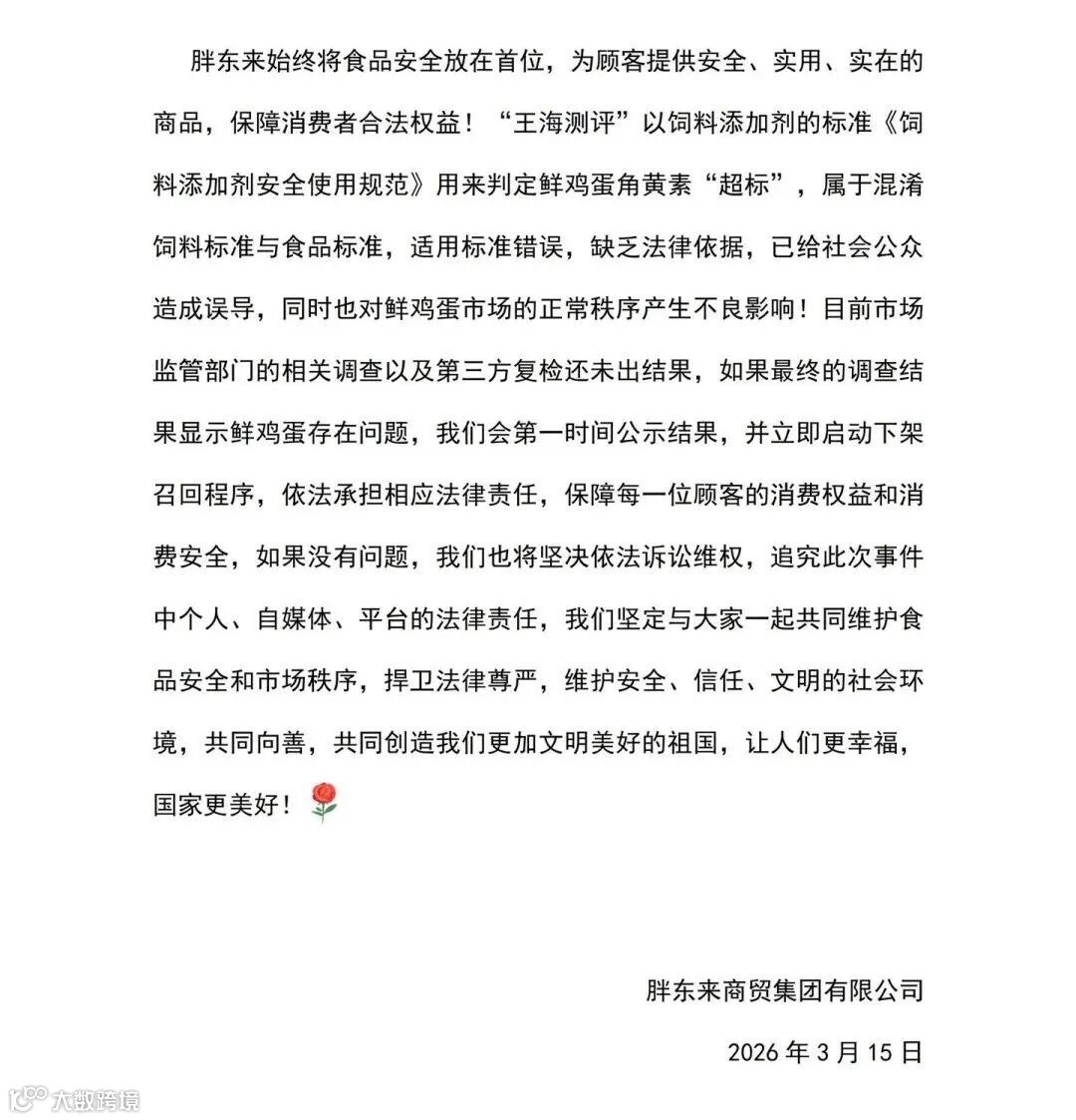3月13日,知名打假人王海团队公开爆料称,送检了胖东来卖的十款鸡蛋,均检出人工角黄素(斑蝥黄),直指品牌涉嫌虚假宣传。