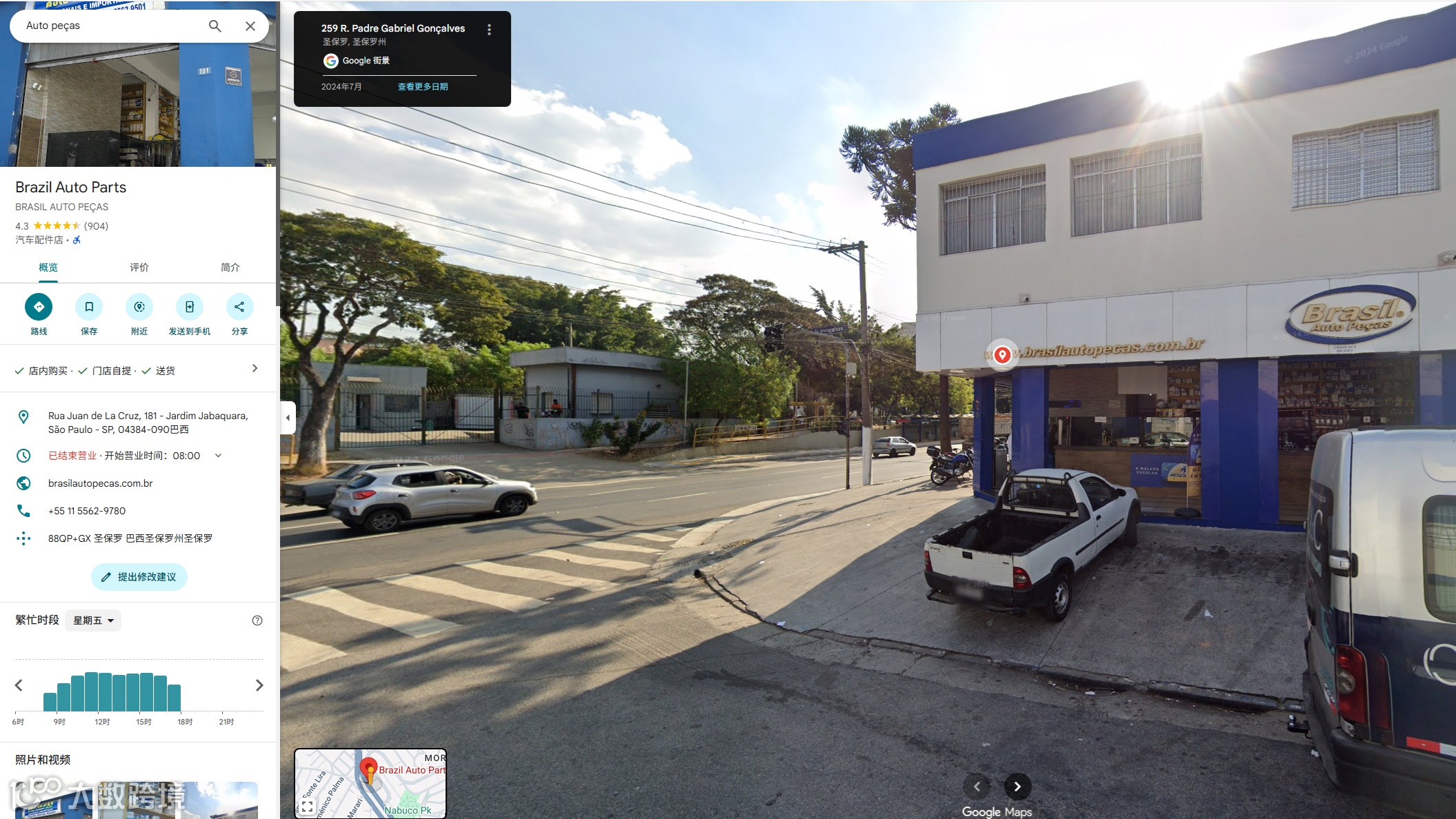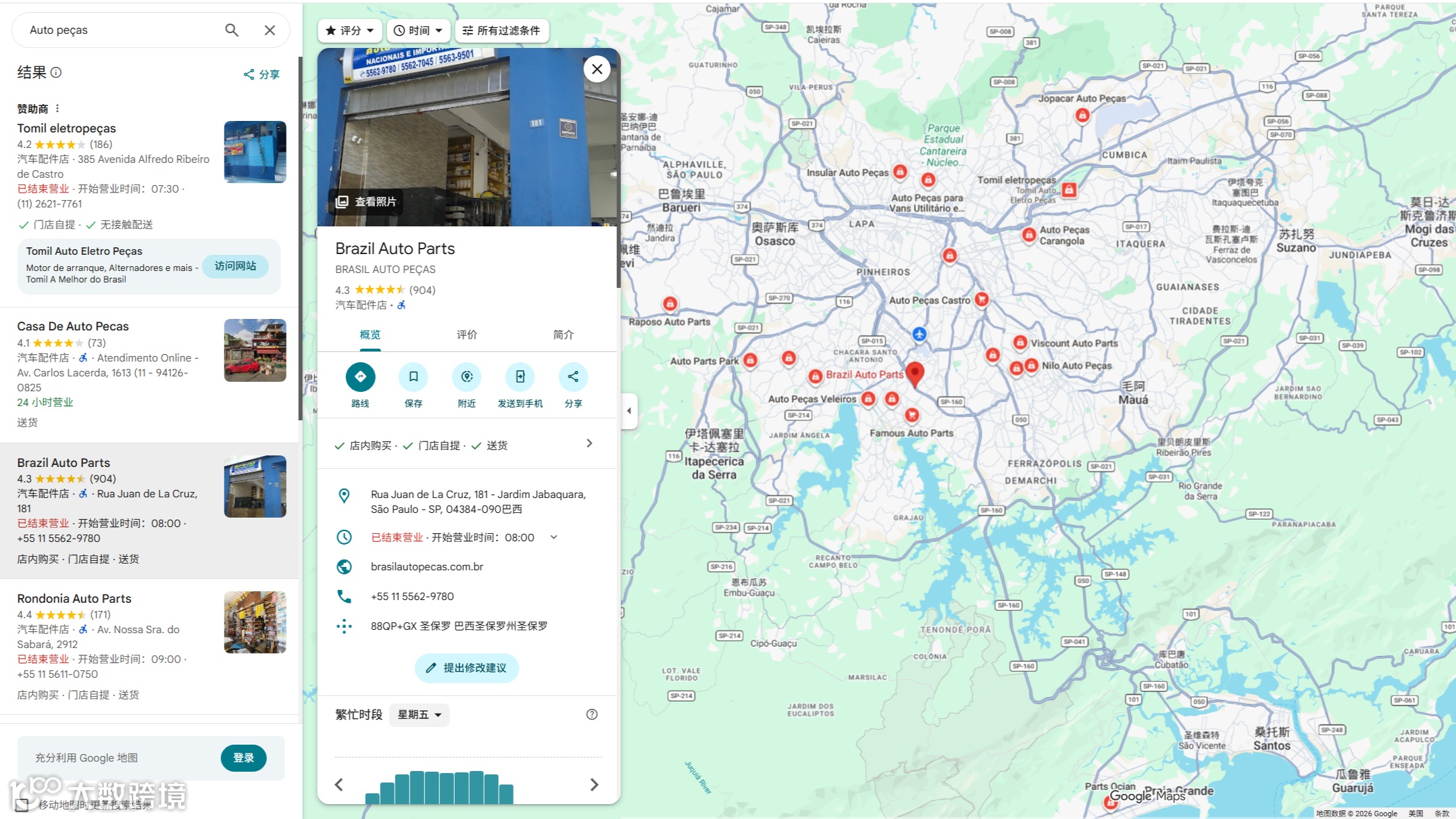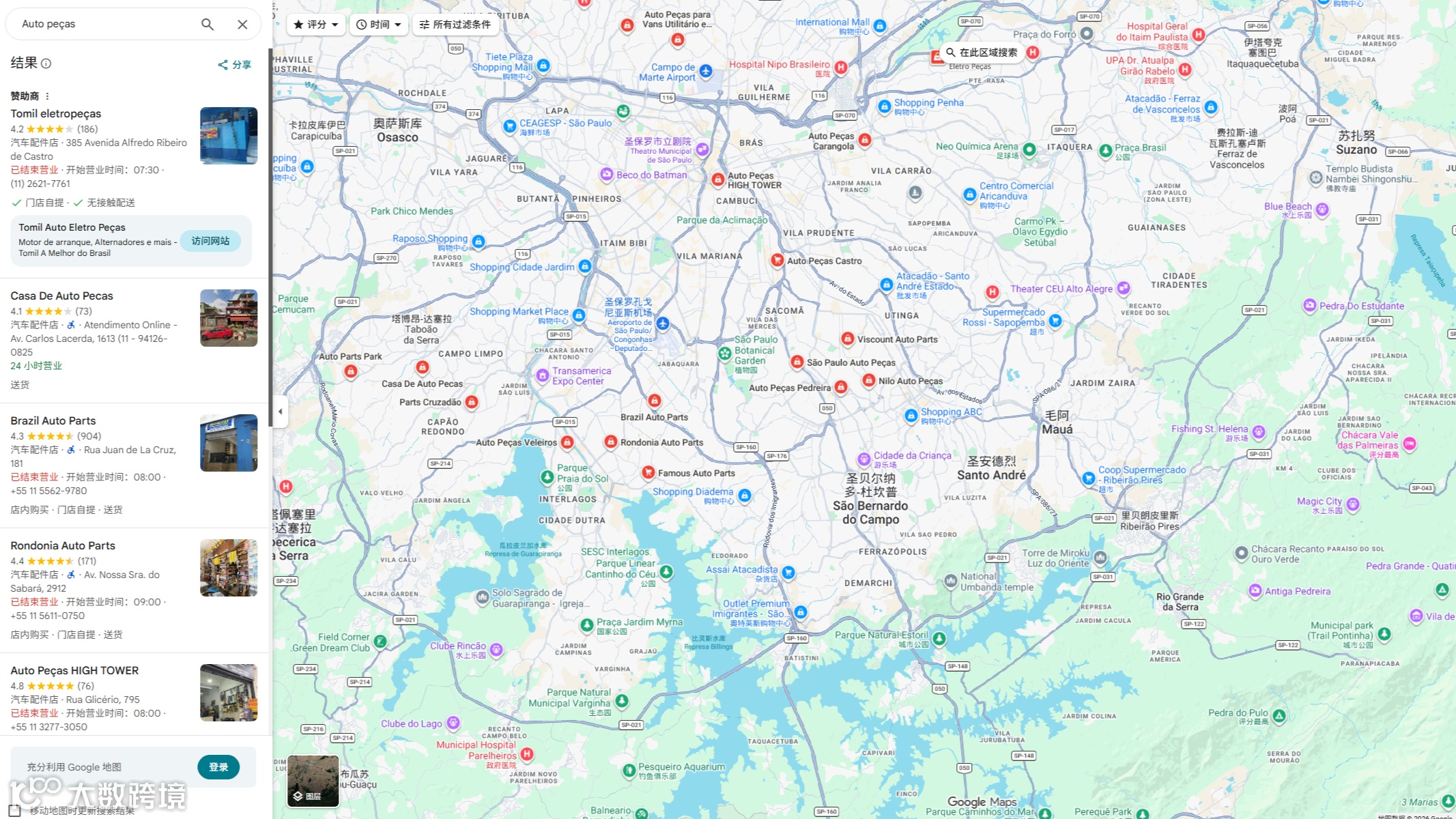 - 输入关键词搜索:在地图上输入对应的英语或葡萄牙语关键词,如汽车零部件“Auto peças”,点击搜索,即可找到对应的企业或门店。