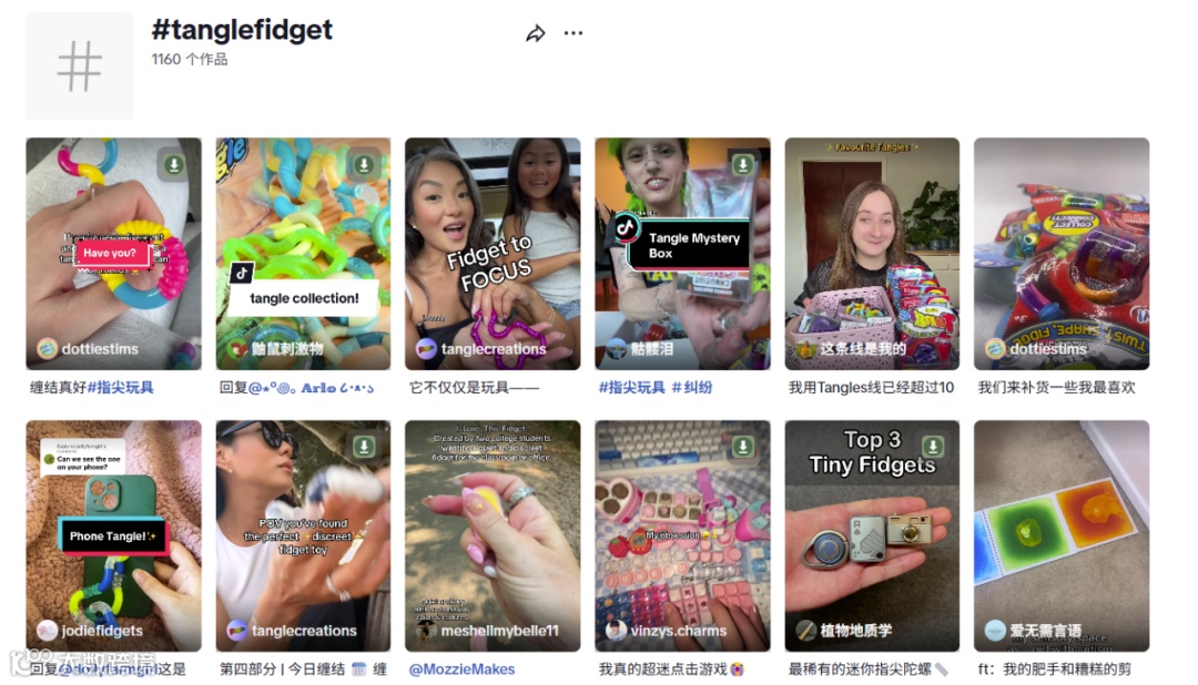 在TikTok上,#Tangle Fidget 话题下已积累超千条视频,内容以好物推荐、开箱体验为主,发布者多为20至30岁的年轻人,且大量来自KOC(关键意见消费者)和自发分享用户,内容真实感强,易于引发共鸣。