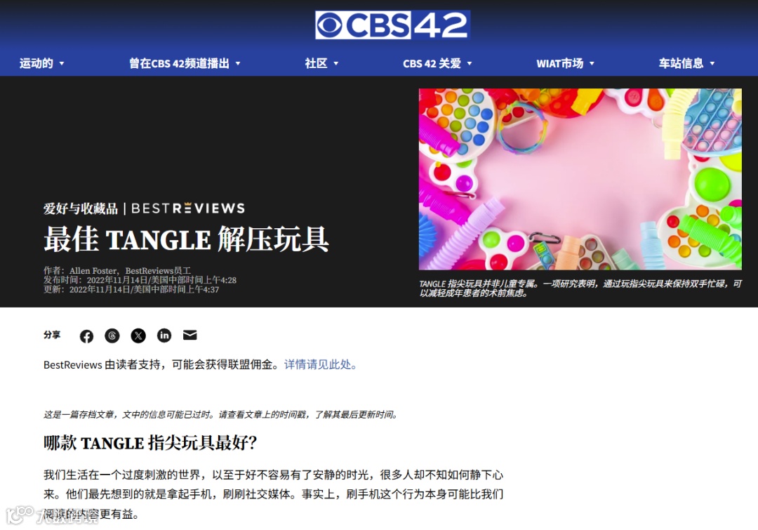 例如美国地方电视台CBS42曾发布“最佳Tangle玩具推荐”专题文章,内容涵盖产品介绍到单品推荐,并嵌入亚马逊购买链接,直接带动销售转化。