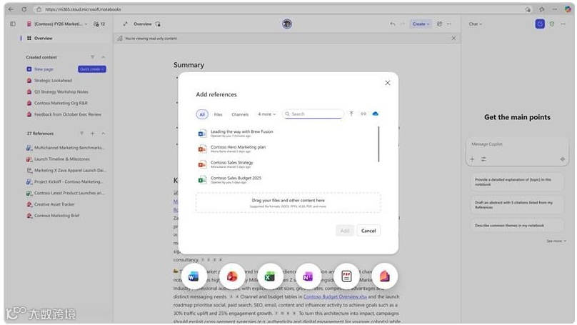现支持添加 Word、PowerPoint、Excel、OneNote 页面、PDF、Copilot Pages 等多种格式,后续持续扩展。