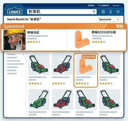 Banner广告则基于实时行为生成原生展示位:当用户搜索“Mowers”,系统自动调取赞助商产品图(如3M耳机),叠加割草机分类页视觉背景,生成高度契合的定制化Banner。