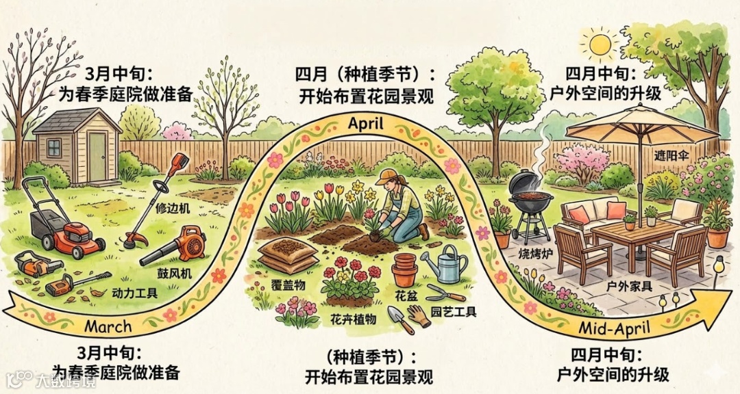 消费者通常自3月中旬起便启动春季庭院准备——前期聚焦割草机、修边机、鼓风机及动力工具等基础整理设备;进入四月种植季,流量达峰,覆盖物、花卉植物、花盆、园艺工具成热销主力,其中“5袋10美元”覆盖物广受青睐;后期则转向户外空间升级,如户外家具、烧烤炉、遮阳伞等。