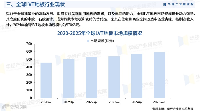 2024年全球LVT地板市场规模约570亿元;中国LVT地板市场规模达188亿元,保持稳健增长态势。