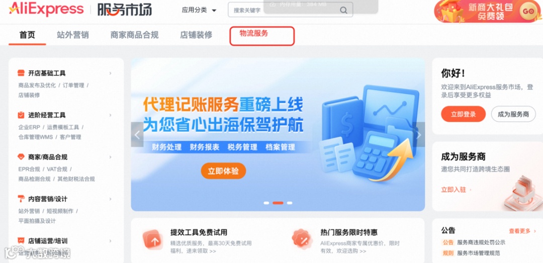 - 侧边栏设专属物流服务栏目,商家可在“服务市场”按需查询与对接。