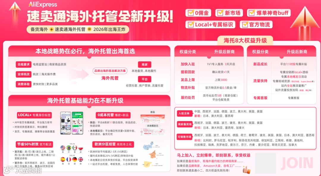 速卖通海外托管模式迎来全面升级,核心为:商家本地备货、本地履约,平台负责经营托管、用户营销与流量运营。
