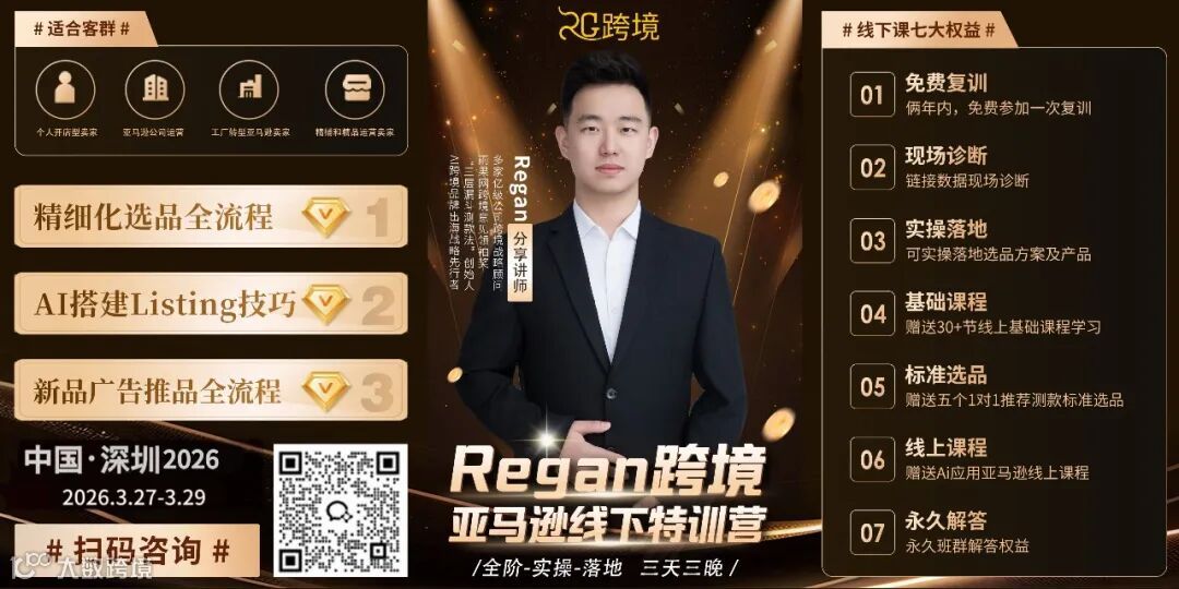 十年亚马逊精品运营经验,深耕家居、服装类目,操盘亿级店铺;Regan跨境IP创始人,专注为新手卖家提供实战、系统、可落地的培训体系。