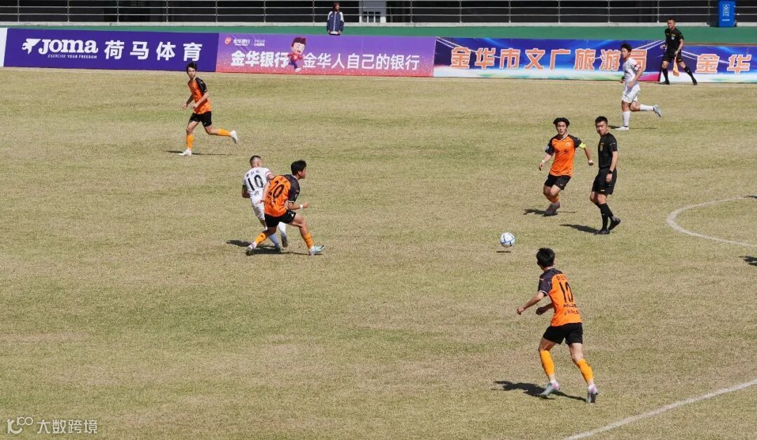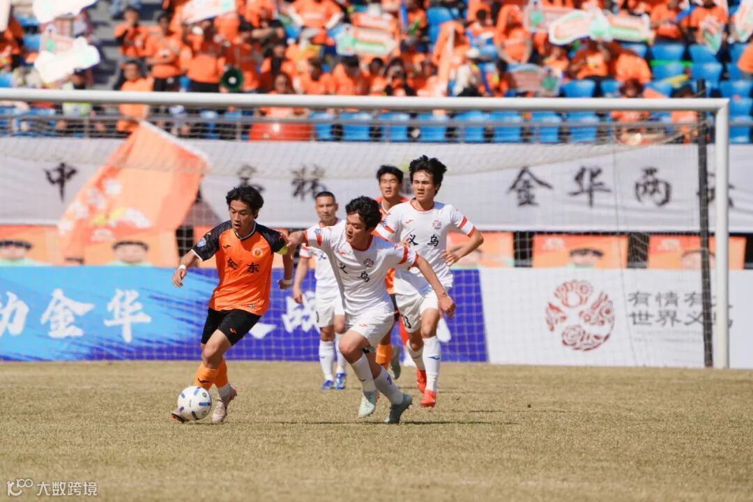 双方队员在中场的拼抢都非常凶狠,金东队依然是通过防守,寻找进攻机会,而义乌队则是采取高位逼抢的战术,给予金东队控球压力。