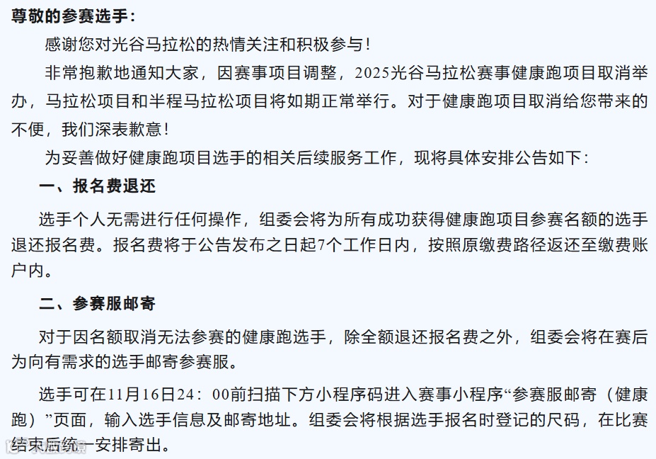突发,武汉大型马拉松赛事,2025光谷马拉松官方宣布,因赛事项目调整,2025光谷马拉松赛事健康跑项目取消举办,马拉松项目和半程马拉松项目将如期正常举行。对于健康跑项目取消给您带来的不便,我们深表歉意!为妥善做好健康跑项目选手的相关后续服务工作,选手个人无需进行任何操作,组委会将为所有成功获得健康跑项目参赛名额的选手退还报名费。对于因名额取消无法参赛的健康跑选手,除全额退还报名费之外,组委会将在赛后为向有需求的选手邮寄参赛服。2025武汉光谷马拉松定档于2025年11月16日,在华中科技大学起跑,调整为全程马拉松,半程马拉松两个项目。