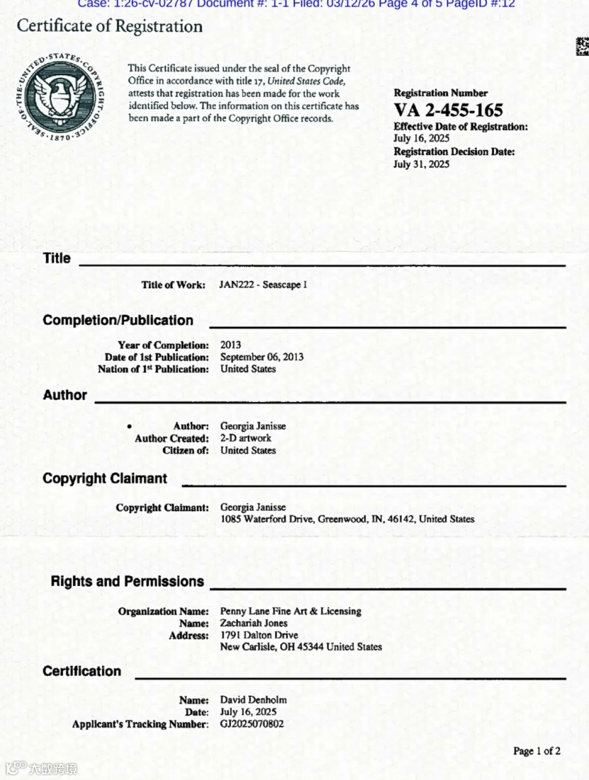 2026年3月12日,Georgia Janisse在美国伊利诺伊州北区联邦法院(Illinois Northern District Court)提起版权侵权诉讼,案号26-cv-02787。