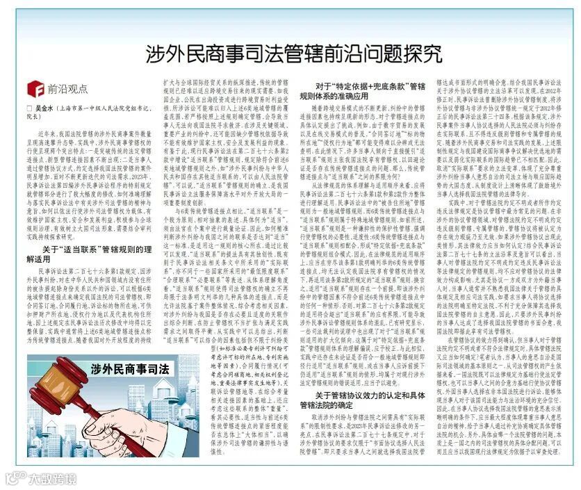 近日,《法治日报》刊发上海一中院党组书记、院长吴金水署名文章《涉外民商事司法管辖前沿问题探究》。全文聚焦2023年《民事诉讼法》涉外管辖规则修订要点,系统阐释“适当联系”管辖规则的立法意旨、适用边界与实践路径。