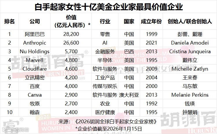 胡润研究院发布《2026胡润全球白手起家女企业家榜》