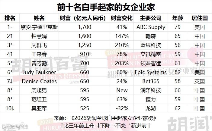 Judy Faulkner排名第六,财富较三年前上涨60%。她依托Epic Systems布局AI驱动的医疗健康软件业务,并持续推动业务版图扩张,稳固了美国在前十强中的席位。范红卫的财富较三年前增长63%,达到595亿元人民币,其掌舵的苏州恒力不仅将新增的造船业务推向全球第一梯队,核心石化业务也保持稳健增长态势。“数据中心女王”周超男是榜单中排名最高的新晋上榜者,伴随润泽科技云数据中心业务的爆发式增长,她一举跻身胡润全球白手起家女企业家榜前十。“在线博彩女王”Denise Coates是英国白手起家女首富,旗下企业Bet365延续了业务增长势头。而曾经的榜首、龙湖的吴亚军,受中国房地产市场持续承压的影响,财富较三年前缩水三分之一,降至525亿元人民币。