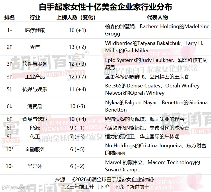 医疗健康行业诞生16位白手起家的女性十亿美金企业家,位居各行业首位,其次是零售业(13位)、软件与服务行业和工业产品行业(各12位);半导体行业首次跻身前十