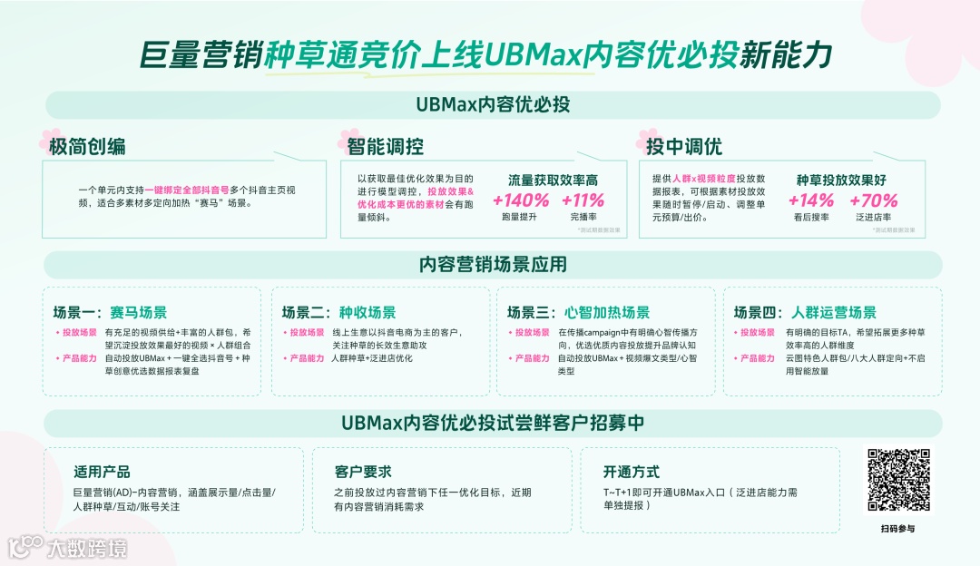 AI贯穿洞察、选人、种草、复盘全路径;全新自动化系统UBMax内容优必投,支持模型自动学习投放策略、探索流量,全面提升种草效果与效率。