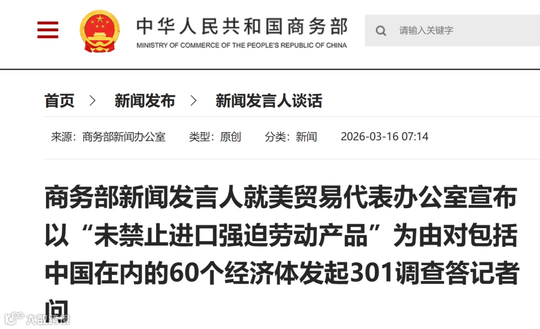 答:中方注意到,美方于3月12日以所谓“未禁止进口强迫劳动产品”为由,对中国及另外59个经济体启动301调查。这是继3月11日美方就所谓“产能过剩”发起301调查后,连续发起的第二项301调查。