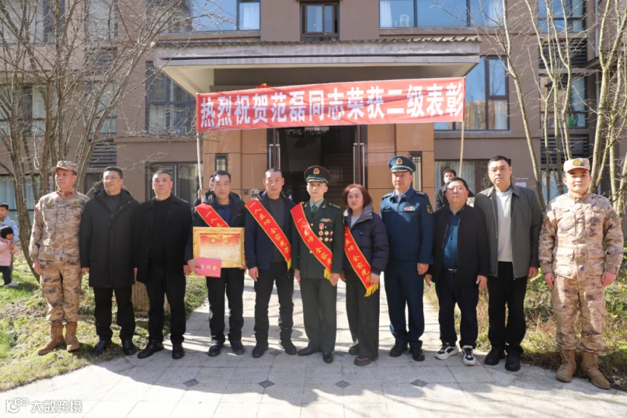 送喜现场暖意融融、气氛热烈。军地领导为范磊家属披上“一人立功 全家光荣”红色绶带,县人武部负责同志郑重宣读立功喜报。当二级表彰喜报被庄重悬挂于家门楣,暖阳映照,荣光尽显。围观群众纷纷驻足点赞:“老范家这孩子,真是家乡的骄傲!”
