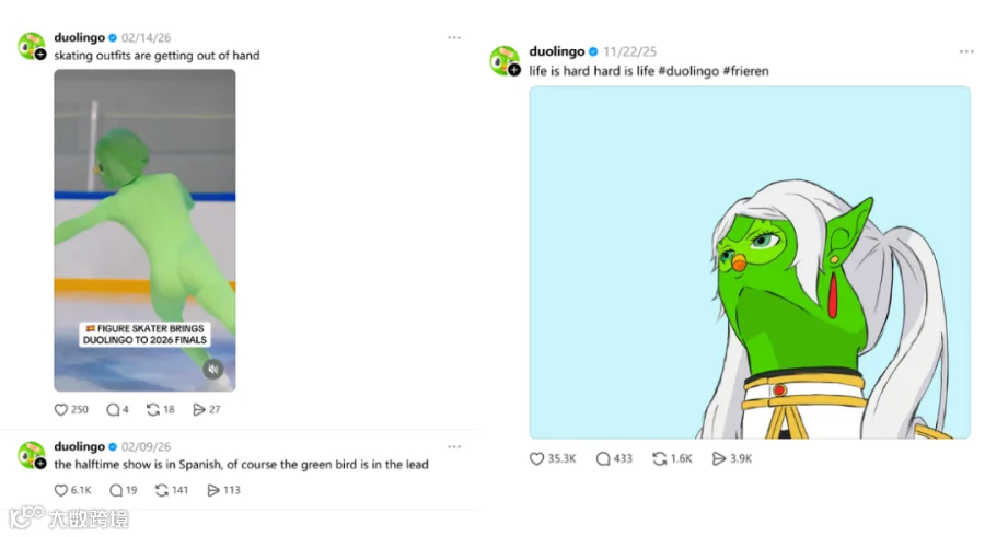 Duolingo(语言学习APP)在Threads上延续其标志性的绿色猫头鹰人设