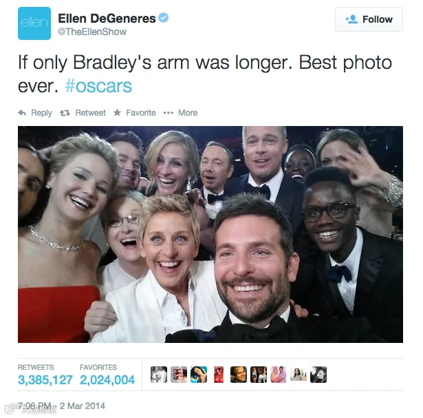 图为Bradley Cooper用三星Galaxy Note 3在奥斯卡颁奖礼上和一众明星的自拍,这张照片一度是X(前推特)史上转发量最高的推文