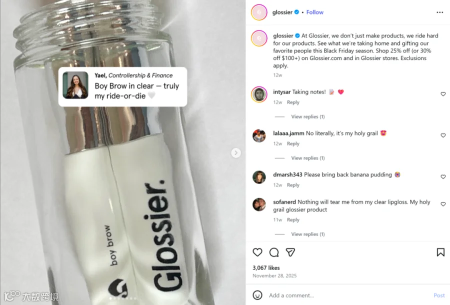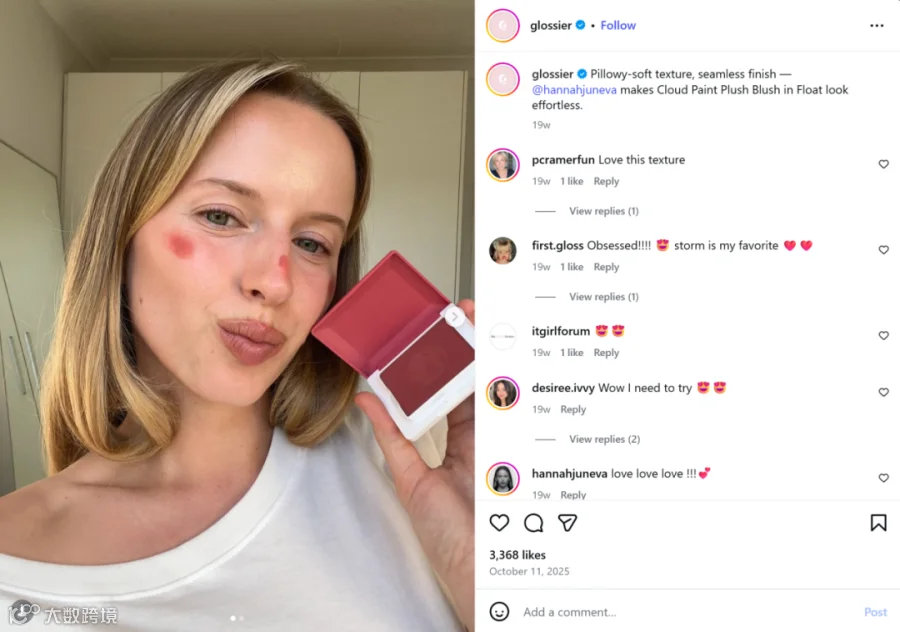 美妆品牌Glossier的Instagram账号经常搬运用户使用品牌产品的效果图