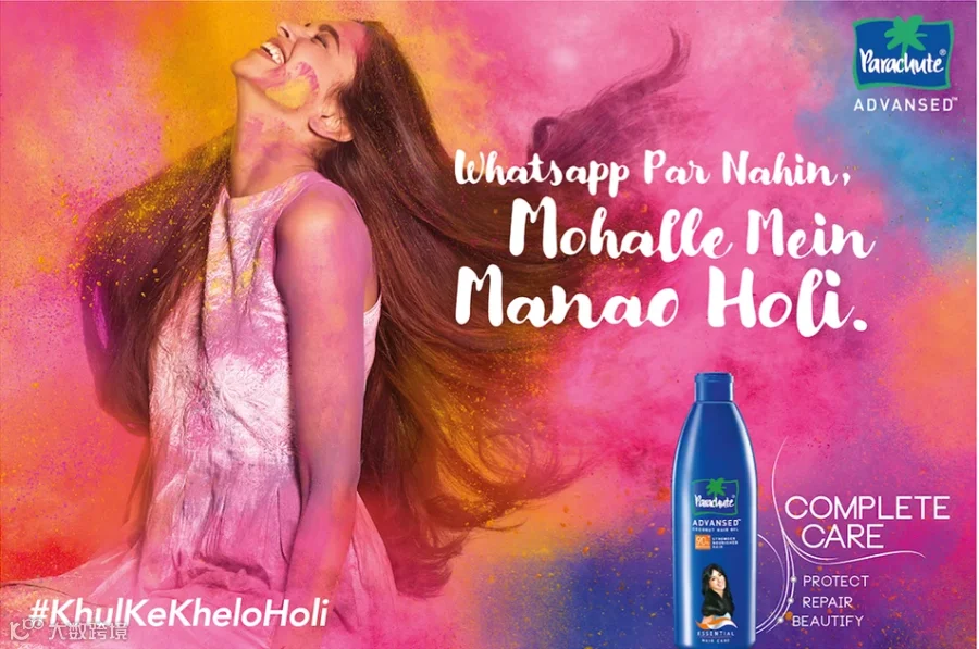 反其道行之,洒红节结束后的清理阶段也是一个真实的生活场景,衣物染色、皮肤粉末残留、周遭环境需要快速恢复原状等,都是很好的介入点。洗涤品牌可以很好地利用这个场景来展示产品的强力洗涤与去渍能力,比如前后对比、实拍清洗过程等方式直观展示。
