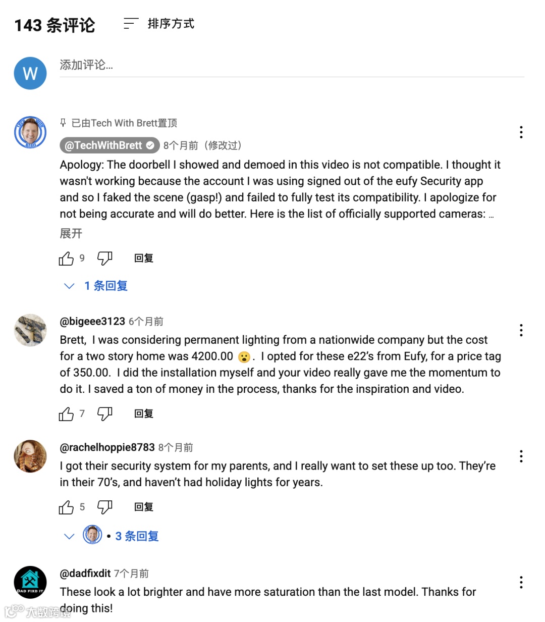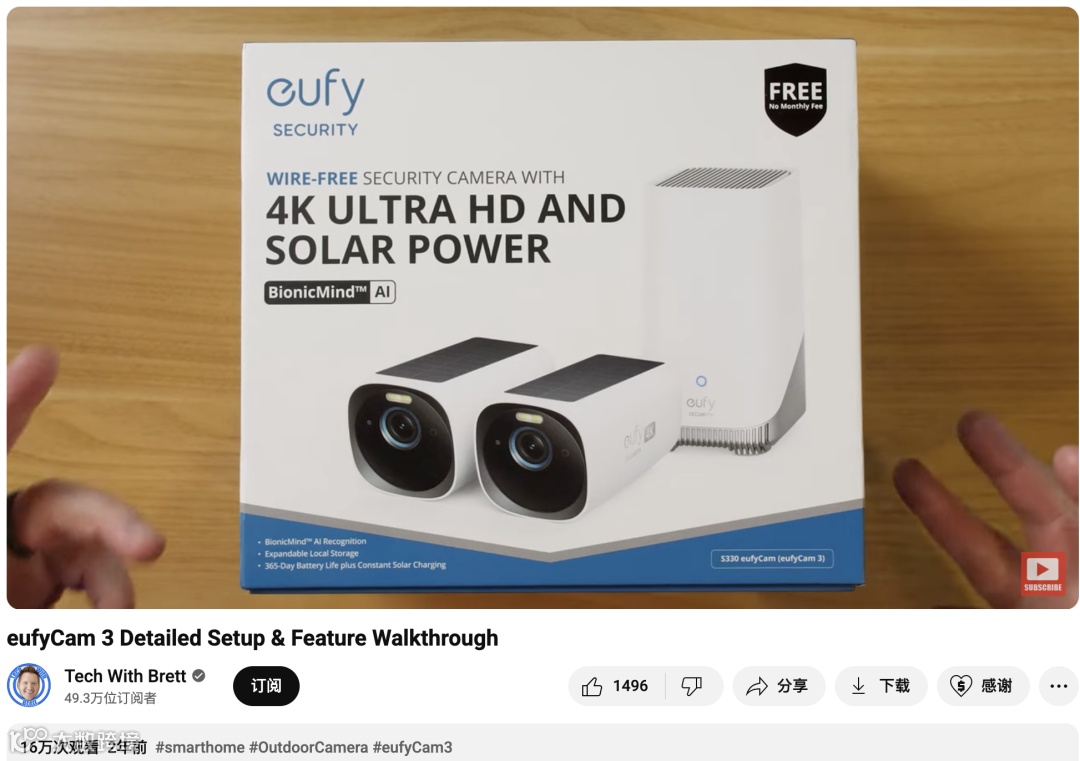 值得一提的是,Tech With Brett在视频结尾处提供了产品购买链接,借助其频道的高流量与用户信任度,有效推动了从内容观看到产品转化的闭环营销。他并非简单地推销产品,而是通过真实体验与详尽测评,帮助观众判断产品是否真正符合自己的需求,这种基于信任的内容输出方式,也为Eufy品牌形象加分不少。
